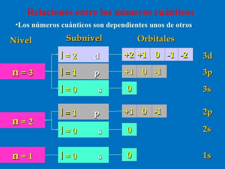 - I) El número cuántico principal n Este número cuántico está relacionado tanto con la energía como con la distancia media entre el núcleo y el electrón, medida en niveles energéticos, aunque la distancia media en unidades de longitud también crece monótonamente con n. Los valores de este número, que corresponde al número del nivel energético, varían teóricamente entre 1 e infinito, pero solo se conocen átomos que tengan hasta 8 niveles energéticos en su estado fundamental ya que el número atómico y el número cuántico principal se relacionan mediante 2n2 = Z < 110.